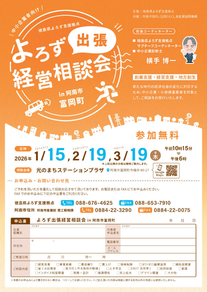 「徳島県よろず支援拠点」は、中小企業・小規模事業者の皆様の起業から商品開発、販路拡大、事業承継などのいろいろな経営課題に対応しております。新たな時代の経済社会の変化に対応するため、中小企業・小規模事業者を対象として経営や支援施策についてのご相談をお受けいたします。経営課題の解決へサポートいたしますので、お気軽にご相談ください。