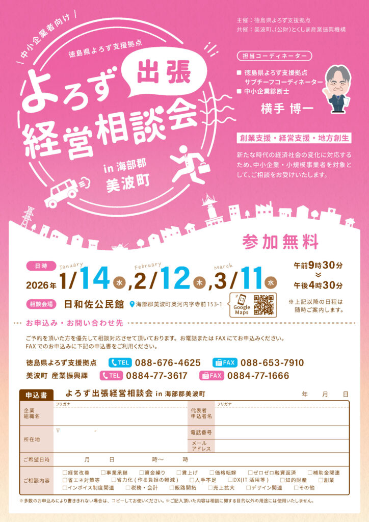 「徳島県よろず支援拠点」は、中小企業・小規模事業者の皆様の起業から商品開発、販路拡大、事業承継などのいろいろな経営課題に対応しております。