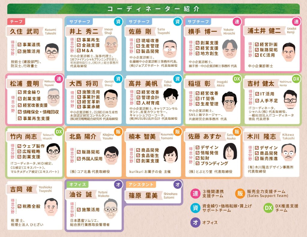 ■経営改善、資金繰り、ゼロゼロ融資返済、事業再生・再チャレンジ、事業承継、創業、雇用・労働、人手不足、IT活用・DX推進、現場改善・生産性向上、賃上げ・価格転嫁、売上拡大、商品開発、販路開拓、広報戦略、デザイン関連、海外展開、施策活用、事業計画策定、補助金関連、省力化(作る負担の軽減)、省エネ対策等、地域資源活用、財務全般……他に知的財産、法律関係は弁護士、労務関係は社労士とタグを組んで相談に応じます。