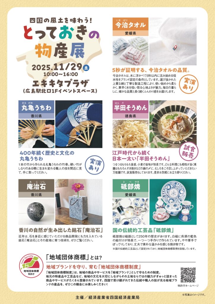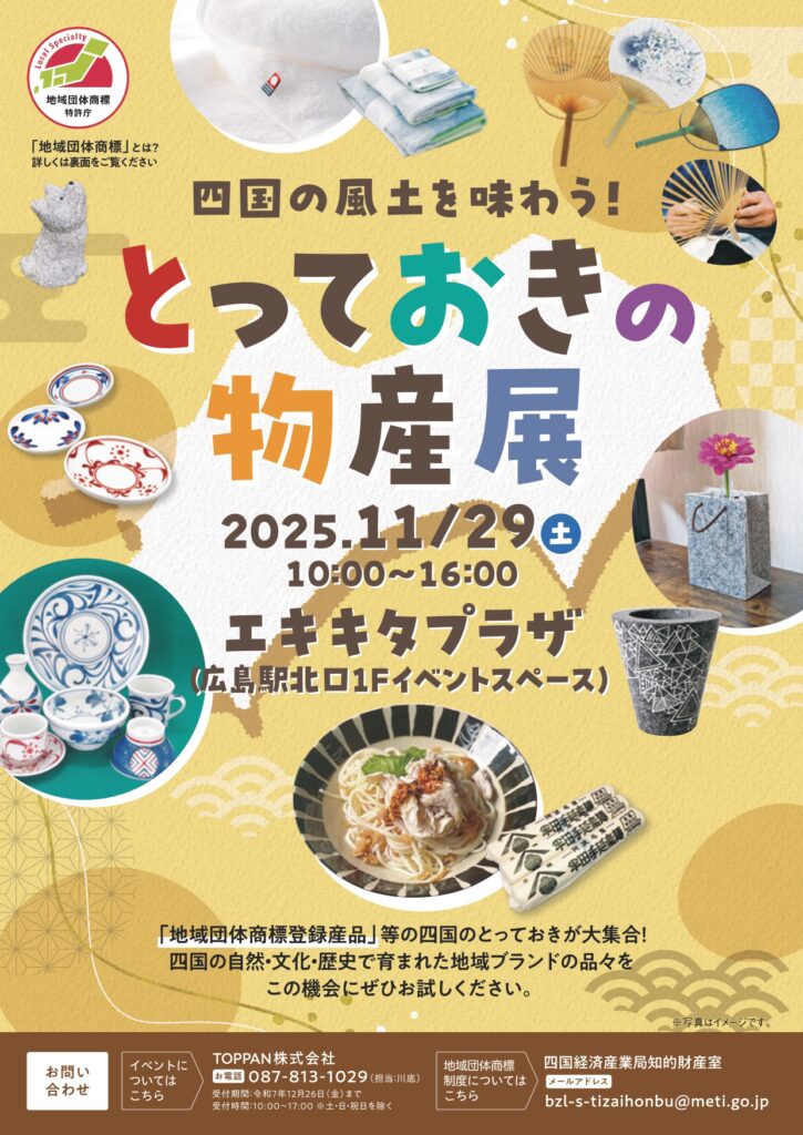 | ■「四国の風土を味わう!とっておきの物産展」を開催します! (四国経済産業局ウェブページ) https://www.shikoku.meti.go.jp/01_releases/2025/10/20251028b/20251028b.html ■問い合わせ先 【お問い合わせ先】 四国経済産業局 地域経済課 知的財産室 電話:087-811-8519 E-MAIL:bzl-s-tizaihonbu@meti.go.jp<mailto:bzl-s-tizaihonbu@meti.go.jp> チラシのダウンロード 【参考】 ・地域団体商標制度とは 「地域名」と「商品(サービス)名」からなる地域ブランドの名称を保護することにより、 地域経済の活性化を図ることを目的とした制度です。 ・地域ブランドの保護は、地域団体商標制度で(特許庁ウェブページ) https://www.jpo.go.jp/system/trademark/gaiyo/chidan/index.html |