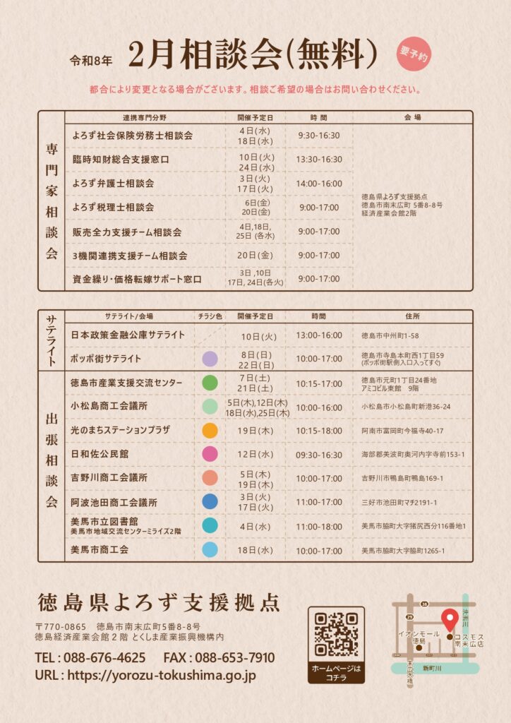 2月 よろず相談会一覧 2026年1月26日 最終更新日時 : 2026年1月30日 STAFF徳島よろず クリックで画像ダウンロードができます。 相談予約・お問い合わせ徳島県よろず支援拠点相談予約フォーム