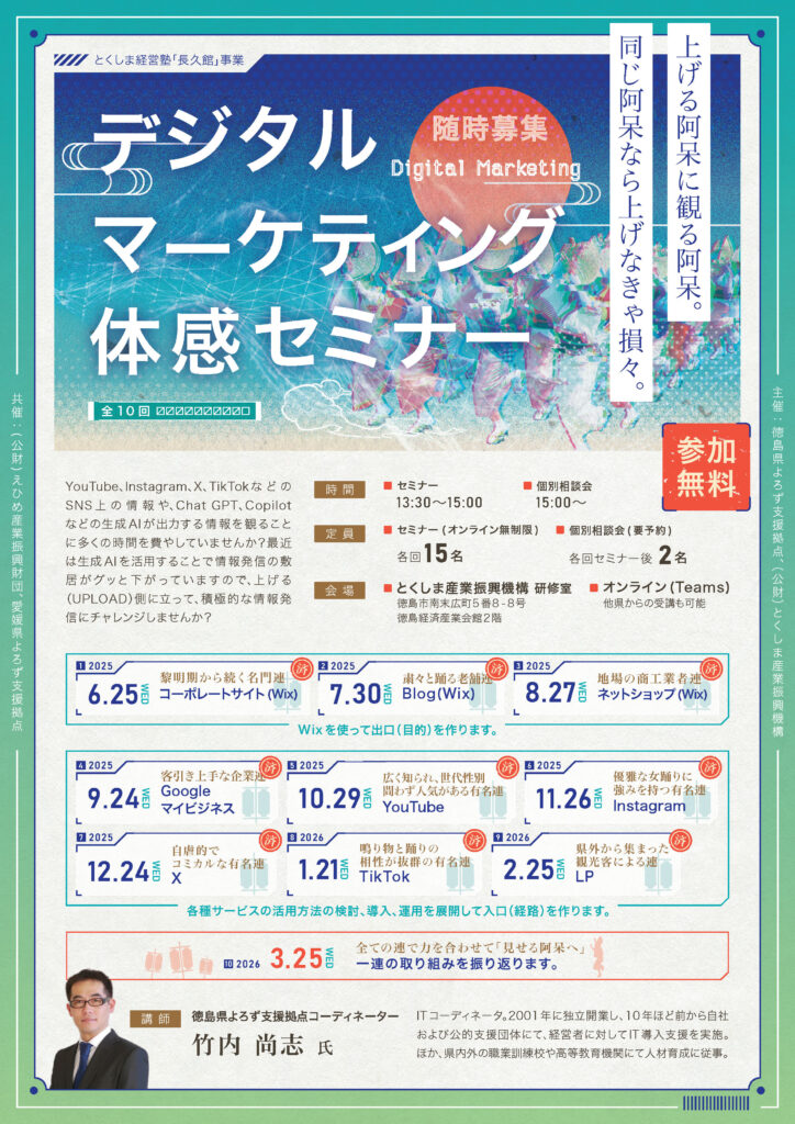 | 開催日時 | ① 6月25日(水)「コーポレートサイト(Wix)」 黎明期から続く名門連 ② 7月30日(水)「Blog(Wix)」 粛々と踊る老舗連 ③ 8月27日(水)「ネットショップ(Wix)」 地場の商工業者連 ④ 9月24日(水)「Google マイビジネス」 客引き上手な企業連 ⑤10月29日(水)「You Tube」 広く知られ, 世代性別問わず人気がある有名連 ⑥11月26日(水)「Instagram」 優雅な女踊りに強みを持つ有名連 ⑦ 12月24日(水)「X」 自虐的でコミカルな有名連 ⑧ R8年1月21日(水)「Tik Tok」 鳴り物と踊りの相性が抜群の有名連 ⑨ R8年2月25日(水) 「LP」 県外から集まった観光客による連 ⑩ R8年3月25日(水)「一連の取り組みの振り返り] 全ての連で力を合わせて『見せる阿呆へ』 ※ 個別相談はご予約の方を対象に各セミナー後に順次ご案内致します。お時間をいただく場合があります。 |