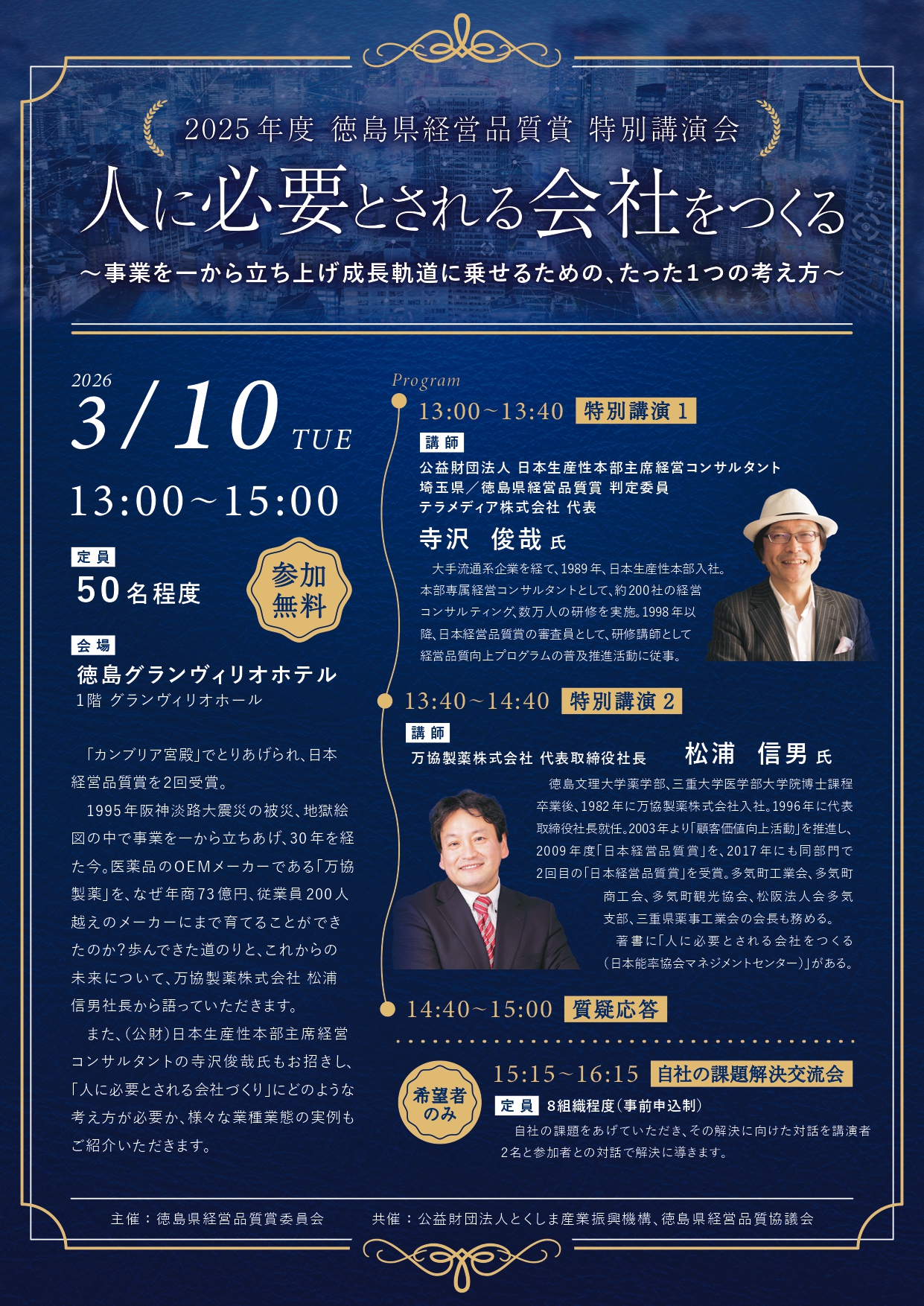 また、(公財)日本生産性本部主席経営コンサルタントの寺沢俊哉氏もお招きし、「人に必要とされる会社づくり」にどのような考え方が必要か、様々な業種業態の実例もご紹介いただきます。