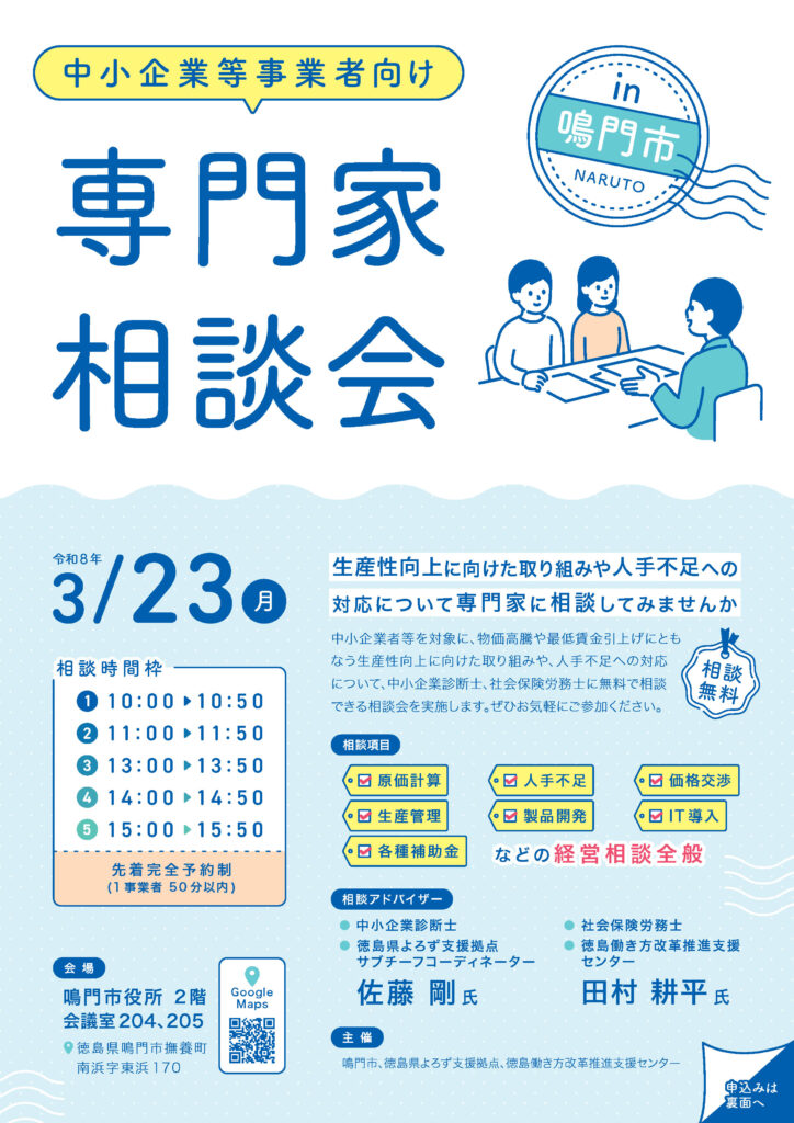 【3/23】中小企業事業者向け専門家相談会 in 鳴門市